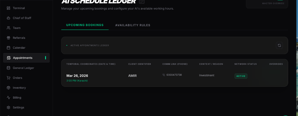 Let your clients book meetings directly through WhatsApp. ShadowBook checks your strict working hours, cross-references your existing appointments, and locks in the meeting— all while you sleep.