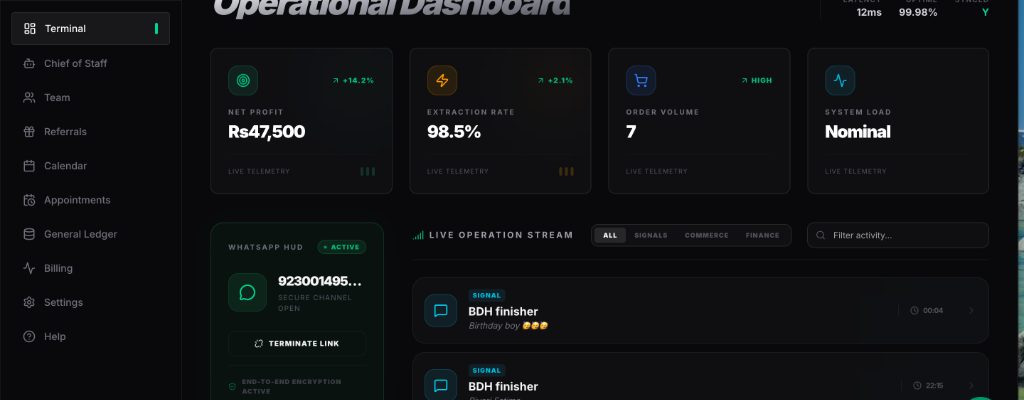 ShadowBook works in the background of your WhatsApp groups and private chats. It extracts tasks and sales without ever triggering 'read' receipts or interrupts. Total stealth.